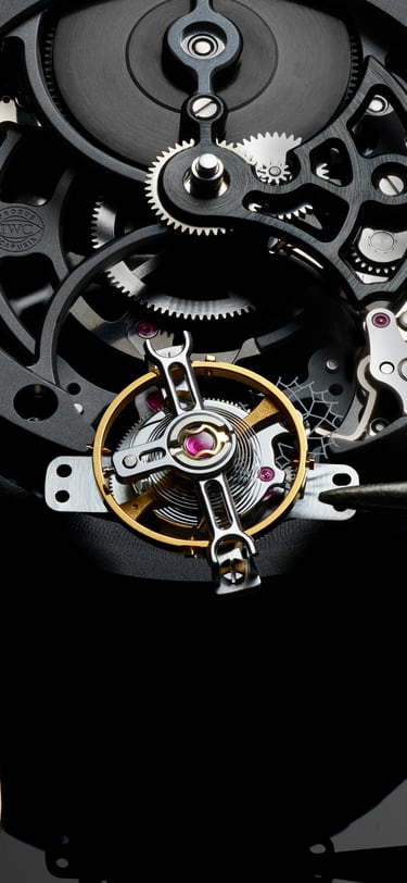 Helwigs Erfindung wird seither „fliegendes“ Tourbillon genannt, weil es so scheint, als schwebe es im freien Raum. Eine Illusion natürlich. Die IWC-Konstrukteure haben diese Idee bei der Portugieser Mystère weitergedacht. Denn sie fertigten das Käfigunterteil, in dessen äussere Zähne ein Tourbillontrieb eingreift, aus gehärtetem, schwarz eloxiertem Leichtmetall. Und der komplette Käfig wiederum läuft reibungsarm auf einem stabilen Kugellager mit Saphirkugeln. Die permanente „Flugschau“ des geheimnisvollen Mechanismus findet somit unverstellt vor nachtschwarzer Bühne statt – ein „schwarzes Loch“, wie es mal ein Uhrmacher formulierte. Es misst 11mm im Durchmesser. Und zieht die Blicke tatsächlich magisch an.