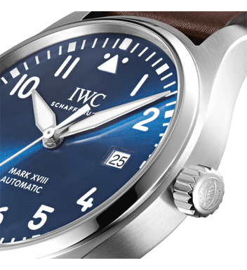 This thematic special edition of the Mark XVIII with blue dial has a compact case that unites all the functions and style cues of a typical Pilot's Watch