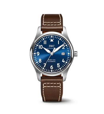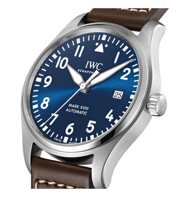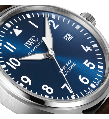 This thematic special edition of the Mark XVIII with blue dial has a compact case that unites all the functions and style cues of a typical Pilot's Watch.
