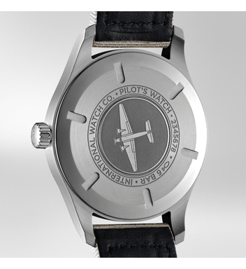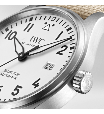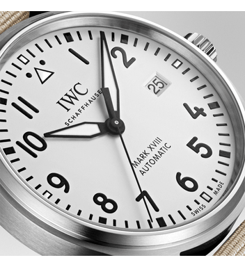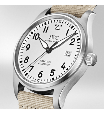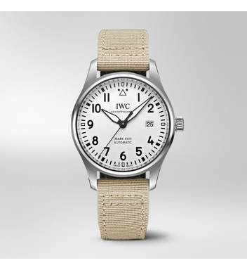 The beige textile strap is extremely comfortable to wear and lends a sporty touch to this Pilot’s Watch Mark XVIII featuring a silver-plated dial and black hands.