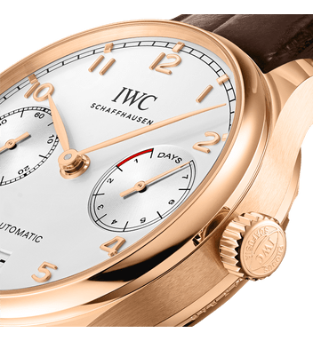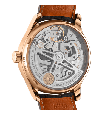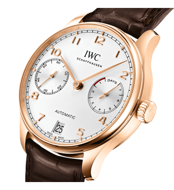 Railway track chapter ring, appliquéd Arabic numerals, feuille hands: no other features express the unmistakable design cues of a typical IWC Portugieser so effectively.