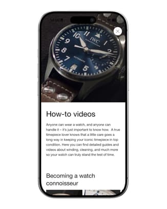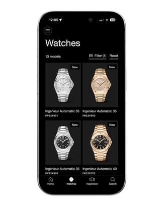 The IWC app is your gateway to the captivating world of IWC Schaffhausen. Whether you want to try on our watches using an innovative augmented reality feature, explore our collections, or learn more about fine watchmaking and its complexities, download the IWC app now and immerse yourself in our world.