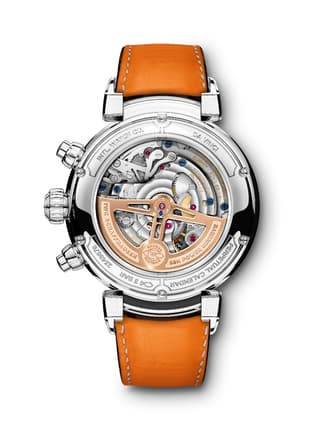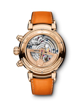 In the 5N gold model, the case, horns, crown and push-buttons are all made of solid 18-carat 5N gold. A gold folding clasp holds the dark brown alligator leather strap by Santoni. In the stainless-steel version with its black alligator leather strap, the slate-coloured counters are equipped with rhodium-plated facets that once again emphasize the circle as an important design element. A glance through the transparent sapphire-glass back cover reveals the sophisticated design of the movement, which has blued screws, a 5N gold rotor and various types of decorative polishing on the bridges. The IWC-manufactured 89630 chronograph calibre with an automatic double-pawl winding system features a 68-hour power reserve.