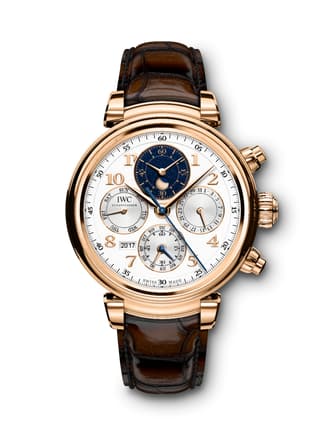 THE DA VINCI PERPETUAL CALENDAR CHRONOGRAPH IS THE BRAND’S FIRST WATCH TO COMBINE THE HOUR AND MINUTE COUNTERS WITH THE MOON PHASE IN A SINGLE SUBDIAL. ACHIEVING THIS CALLED FOR A REDESIGN OF THE IWC-MANUFACTURED 89630 CALIBRE. A SILVER-PLATED OR GOLD-PLATED DISC DEPICTS THE FULL MOON IN ALL ITS GLORY. AT THE SAME TIME, THE ROUNDED, DARK BLUE SECTION OF THE DISC – REPRESENTING THE EARTH’S SHADOW – ROTATES TO SHOW THE WAXING OR WANING MOON. WITH WHITE GOLD PARTICLES SPRINKLED ACROSS THE DARK BLUE BACKGROUND, THE SUBDIAL HAS THE APPEARANCE OF A STAR-STUDDED NIGHT SKY.