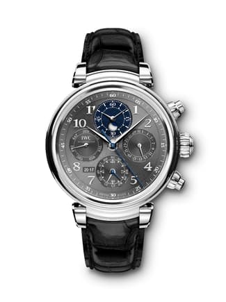 With its 43-millimetre case diameter and case height of 15.5 millimetres, the design of the Da Vinci Perpetual Calendar Chronograph is impressive yet carefully balanced. The crown and the two push-buttons are cylindrical and no longer as round as those of the Da Vinci Perpetual Calendar of 1985. Combined with the large lugs of the moving horns, they create an impression of overall harmony. Despite the many displays, the dial remains clear and uncluttered because the designers chose dark blue as the colour for the chronograph moon phase totalizer at “12 o’clock”. This firmly distinguishes it from the dial and three subdials of the 5N gold version (Ref. IW392101) and the stainless-steel model (Ref. IW392103), which are silver-plated and slate-coloured, respectively.