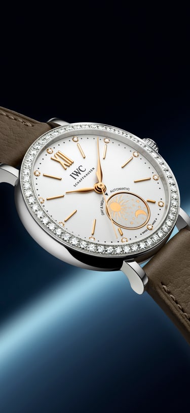 太陽と月の終わりなきダンスを時計の文字盤上で表現する「ポートフィノ・オートマティック・デイ&ナイト 34」は、デイ&ナイト複雑機構を搭載した初のケース径34ミリの「ポートフィノ」モデルです。6時位置に配された小さなディスクが、現在の昼夜を優雅に告げます。正午や真夜中には、太陽または月がディスプレイの上部に美しく現れます。この洗練されたレディースウォッチには、ステンレススティール製のケースにシルバーメッキの文字盤、ゴールドメッキの針とアプライド・インデックスが配されています。ケースと文字盤は0.99カラットの66個のダイヤモンドで装飾されています。改良されたセッティングにより、ダイヤモンドはより多くの光を反射し、一段と際立つ存在感と輝きを放ちます。ストラップにはバタフライ式フォールディング・バックルを備えたトープカラーのカーフスキン・ストラップを採用。植物性タンニンなめし加工が施されたストラップは、自然でしなやかな質感と、洗練された高級感を兼ね備えています。また、クイック交換システムの採用により、簡単に付け替えが可能です。
