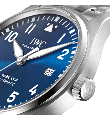 Diese thematische Sonderedition der Mark XVIII mit blauem Zifferblatt vereint in ihrem kompakten Gehäuse alle Funktionalitäten und Stilmerkmale einer typischen Fliegeruhr.